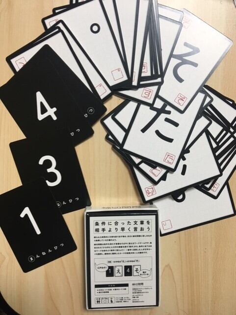 数字のカードとひらがなのカードの組み合わせで言葉、文を作るゲームです。 例えば 数字カードが「2」 「5」 文字カードが「ん」 「ひ」 なら「まんねんひつ」です。
